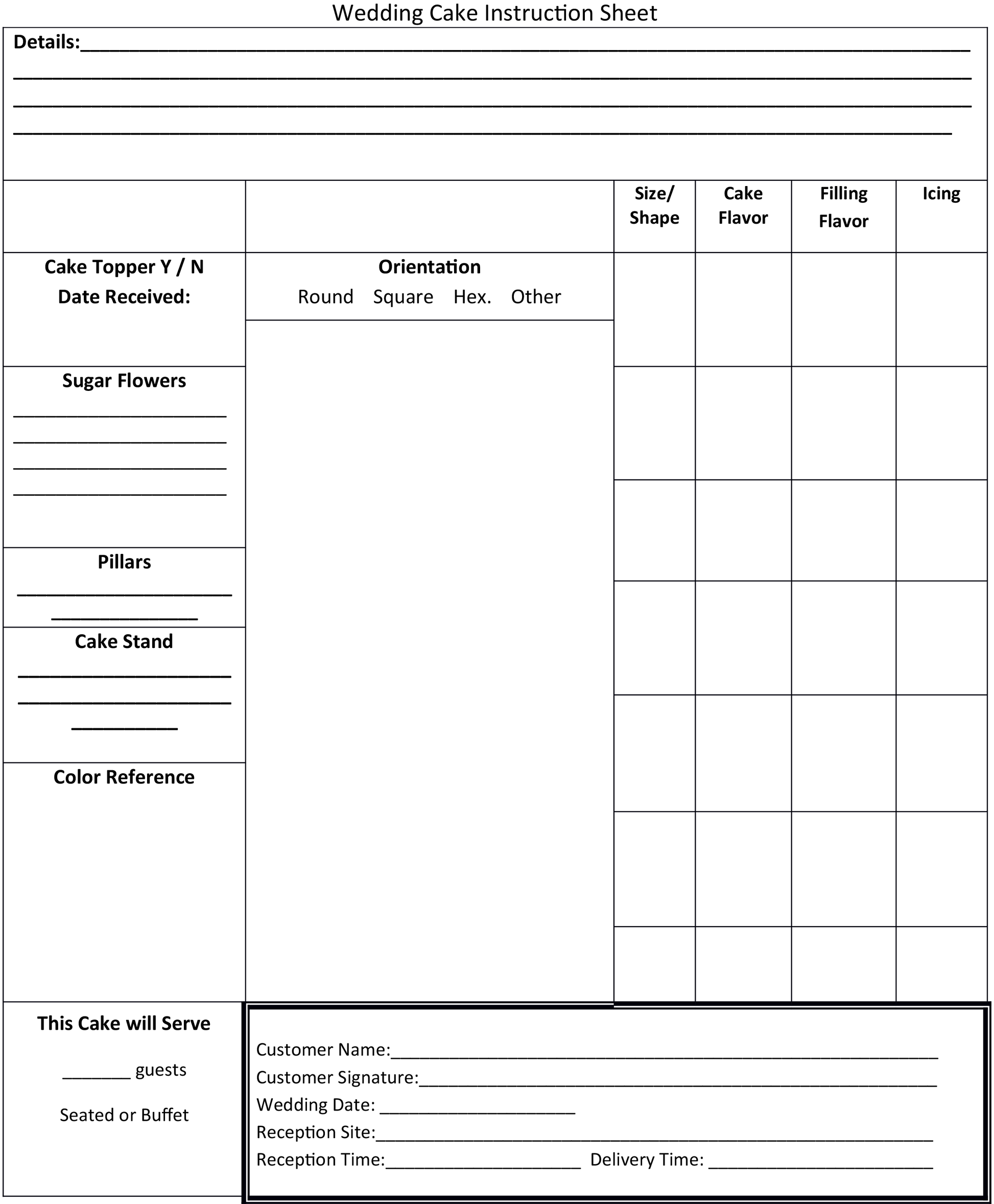 Use this worksheet to record the details of your client cake orders and have your clients sign for approval. Ensure the details are correct every time for you and of your client.